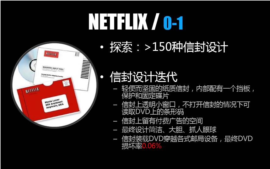 创始人买了DVD,通过邮局寄出去,初始的实验是让人崩溃的。美国的DVD稍微有一点破损就会读不出来,只有一家邮局在特定的条件下能够把它完好无损地寄到。