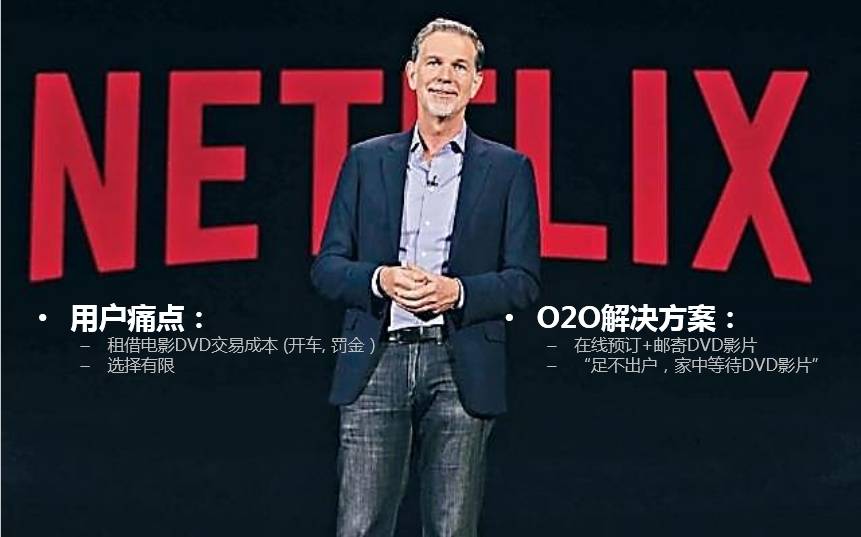 NETFLIX的创始人当时提出了解决方案,算得上O2O行业的鼻祖方案。1997年他提出把原来纯线下的模型变成O2O模型。主要做两块:线上做预定、做支付;线下做仓库和物流,仓库自营,物流用第三方。