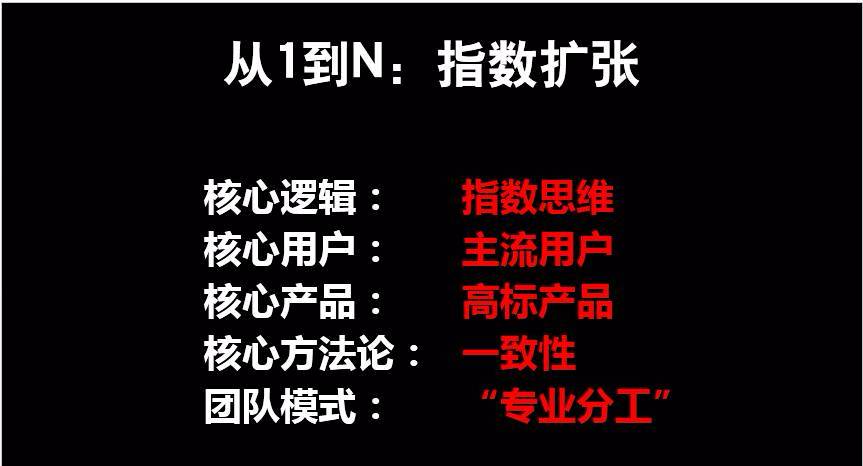 从1到N,不再是减法思维。1到N的核心逻辑是指数思维;核心用户是主流用户;核心产品是高标产品;核心方法论是一致性;核心的团队模式是专业分工。