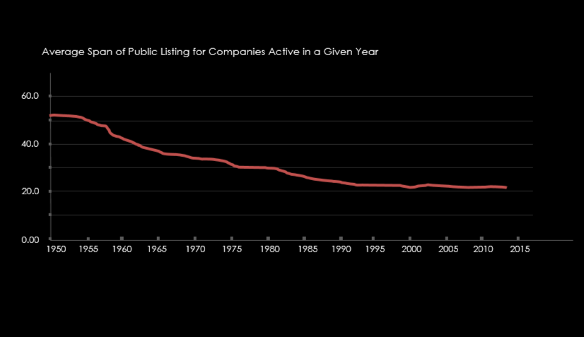 第一组数据侧重的只是一个指标:一家上市公司的寿命大概有多长?1950年的一家上市公司,平均寿命有50年;2014年是20年;2017年是十多年。