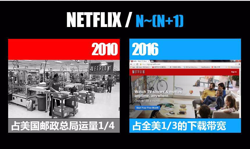 经过转型之后,2012年占全美邮政总局信件四分之一的线下公司,六年之后变成了一家占全美三分之一下载带宽的公司,完成了N到N+1的转型。