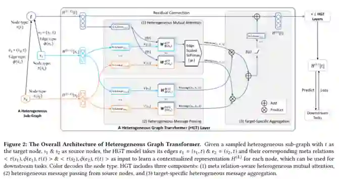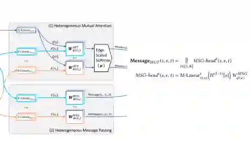 对于左图这样的异构图,可以定义出不同的元关系,每个meta-relation由三部分组成。文中提出相比于R-GCN,HGT的优势在于因为使用了三部分来定义元关系,这使得模型对于出现频次较低的关系的学习能力更强(因为另外两部分出现的频次可能不低)。