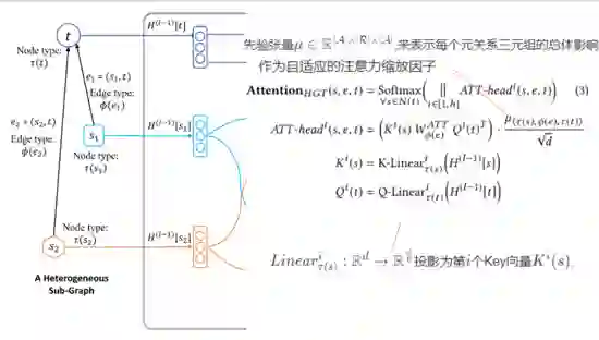 为了处理异构图,文章的核心思想是将每条边的模型参数分解为三个矩阵相乘。其分解根据每条边的三元组 <初始节点类型,边类型,目标节点类型>来定义。这就是文中所提的元关系(meta-relation)。整体的计算参照transformer。以下图为例:
