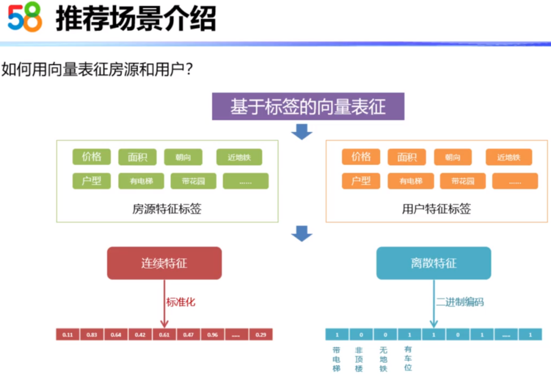 基于标签的向量表征是比较好处理的。比如,对于某个房源有对应的价格、面积、朝向等特征标签;同样的,对于用户也有自己的兴趣偏好,比如价格、面积、近地铁等特征标签。因为用户在选房子的时候,有自己的选择标准,比如价格、户型等,我们可以把房源的标签信息打到用户身上,这样用户也有自己的偏好特性标签。针对这些特征标签的连续型特征,我们可以直接标准化后作为连续型特征标签向量的值。离散型特征可以直接进行二进制编码,加入特征向量里面。