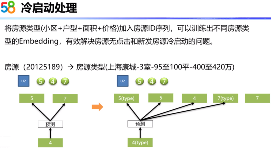 为了解决冷启动的问题,在房源序列中加入了房源的Type类型。比如下图所示的房源,它对应的Type类型为:上海康城小区、户型为3室、面积为95至100平、价格为400万至420万。在训练时通过加入这种Type类型我们得到房源Embedding的同时,也可以得到类型房源的Embedding。当一个房源没有算出具体的Embedding向量时,我们就可以利用这个房源对应的类型向量进行补充。这里把房源对应的类型放在了房源前面,其实也是有一种思想在里面,我们可以认为在用户的看房行为中,用户首先看到了房源列表页的房源信息描述,表示用户对这种小区、户型、面积和价格的组合特征感兴趣了,才点击进入房源的详情页面。所以,用户先有了对房源类型感兴趣,才点击到房源详情页,这是有先后关系的。