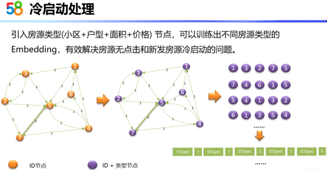 同样地,这里引入Type类型,我们将ID结点的图转化为ID加类型的图。然后通过随机游走,得到ID加类型的序列。图中绿色序列就是房源1类型、房源1ID、房源3类型、房源3ID...。