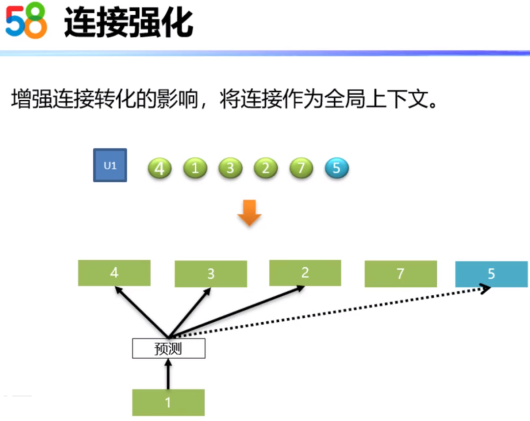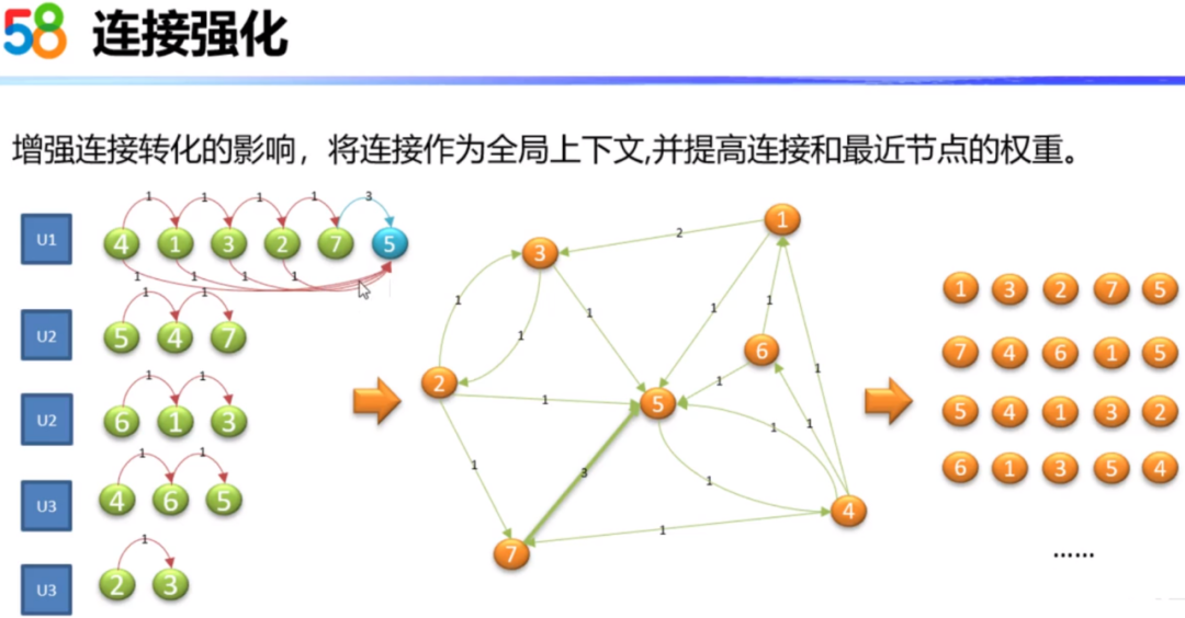 同样地,为了增加连接转化的影响,我们将连接作为全局的上下文,并且提高最近结点的权重。从下图中可以看出,U1用户的房源序列中房源5是连接结点,这样就把4到5、1到5、3到5、2到5都加了转化权重1。7到5由于它们最近,所以转化权重设置为3。通过这样的转化,我们可以得到图中的有向带权图,然后通过随机游走构造出新的房源序列。