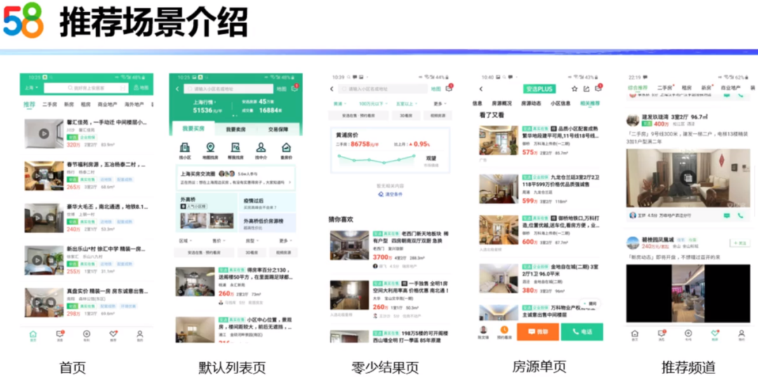 58房产相关推荐位还是比较丰富的。不同的位置,推荐逻辑也有很大的差异。这里以安居客为例,列举了安居客的5个主要推荐位。第一个场景是首页的推荐位,对于进入首页的用户,先判断用户的类型,或者是判断用户来安居客的目的,是找二手房还是看新房或者是租房,真的这些不同的用户推荐不同的房源。第二个场景是默认列表页,在默认列表页用户已经选定了房产类型,这里针对用户的历史行为给用户推荐一些房源。针对新用户的话,我们会使用当前的经纬度推荐一些附近房源或者是热门房源,进行新用户的冷启动。第三个场景是零少结果页,对于零少结果页,我们是可以拿到用户的筛选条件,这时会针对用户的筛选条件做一些相关方面的推荐。第四个场景是房源单页(房源详情页),对于房源单页其实用户已经对这个页面的房产信息感兴趣,这里的“看了又看”主要是推荐当前房源的相似房源。第五个场景是推荐频道,推荐频道主要是用到了Feed流的技术,推拉结合,把用户感兴趣的最新房产信息推荐给用户。