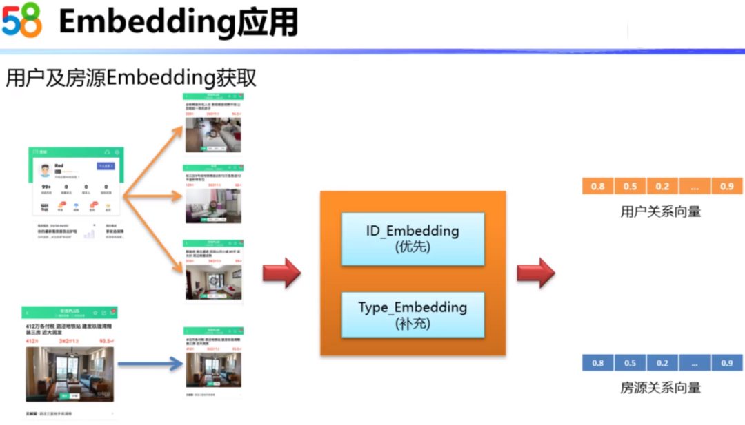 我们计算好房源的Embedding之后,对于用户可以汇总用户看过的房源向量,计算出用户的Embedding向量。针对房源的Embedding,我们可以优先拿对应ID的Embedding向量,当ID的值没有取到时,可以使用Type_Embedding向量。这样我们就可以得到用户关系向量和房源关系向量。