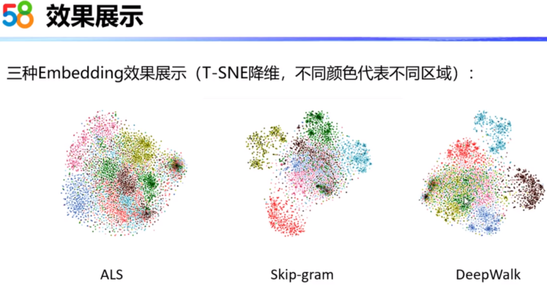 下图是三种Embedding的效果展示,使用了T-SNE进行了降维,不同的颜色代表不同的区域。分的比较清楚的区域,是当前城市比较偏远的区域,这些区域跟其他区域重叠的可能性比较少,所以他们可以分的比较清晰。对于这些重叠的区域,是当前城市的中心区域或者是相邻的区域,由于交通比较便利,用户在找房的时候,这几个区域都在看,所以在颜色上有比较大的交叉。