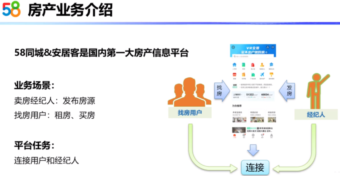 58同城和安居客是国内第一大房产信息平台。作为房产信息平台主要有两种业务场景、两类服务对象。第一类是服务于经纪人,当房产经纪人有卖房需求的时候,可以把房源发布在平台上,平台导入流量进行支持;第二类是服务于找房用户,当用户访问平台的时候,可以浏览到丰富的房源。58同城平台的主要是连接起用户和经纪人,帮助用户找到满意的房子,帮助经纪人卖掉手里的房子。