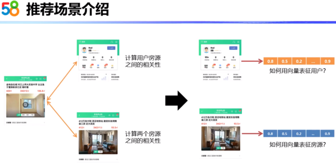 上面介绍了五种不同的推荐位,其实在这些推荐场景中都离不开两类相似性的计算。一类是用户和房源之间的相关性,另一类是两个房源之间的相关性。具体该怎么计算这两类相关性呢?我们首先需要把房源和用户这两个实体用向量表征出来,然后通过计算向量的差异,衡量用户和房源、房源和房源是否相似。