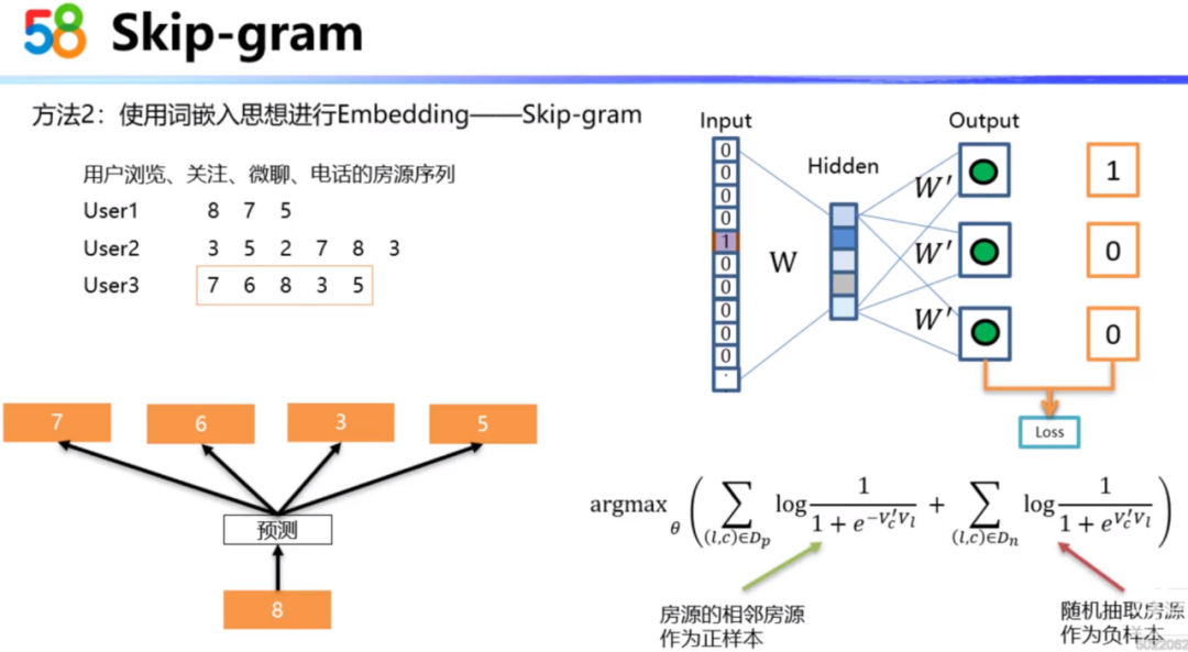 Embedding的第二种方法就是使用自然语言处理中的Skip-gram算法进行向量表征。首先,我们将用户浏览、关注、微聊、电话等行为对应的房源汇总成一个房源序列,这样一个用户的行为序列就相当于一个句子,序列中的房源就相当于词。Skip-gram算法认为相邻的房源是有相关性的房源。这些房源的相互关系可以作为正样本。比如下图中的7、6、8、3、5序列,8和7、6、3、5都可以认为是有正相关性的。然后,我们现在有了一些正样本,可以随机抽取一些出现频率比较高、但是不相邻的房源作为负样本。