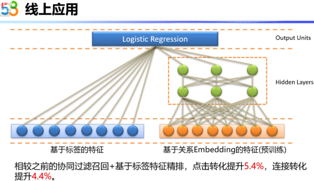 下图展示了线上应用的效果。我们通过标签特征的处理和关系特征的Embedding,可以得到一个综合的输入向量来表征用户和房源之间的关系,最后构建一个综合的监督模型来训练这种关系之间的相似度。为了提高连接率,我们把有连接行为的用户房源对作为正样本,对于只浏览不连接的用户房源对作为负样本。我们就使用了Wide&Deep模型进行了训练,在Wide部分使用了基于内容的标签特征,Wide部分主要负责模型的记忆能力;Deep部分主要负责模型的泛化,使用基于关系的Embedding进行深度学习,通过深度模型的计算可以学习出隐含的特征组合,提高模型的泛化能力。这个模型相较于之前的协同过滤召回+基于标签特征精排,点击转化提升5.4%,连接转化提升4.4%。它对于业务的兼容性也大大提高,在零少结果场景的推荐,在精排阶段可以使用这种关系的相似度。