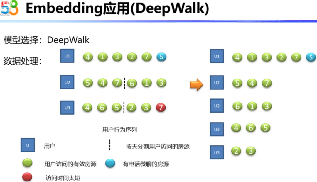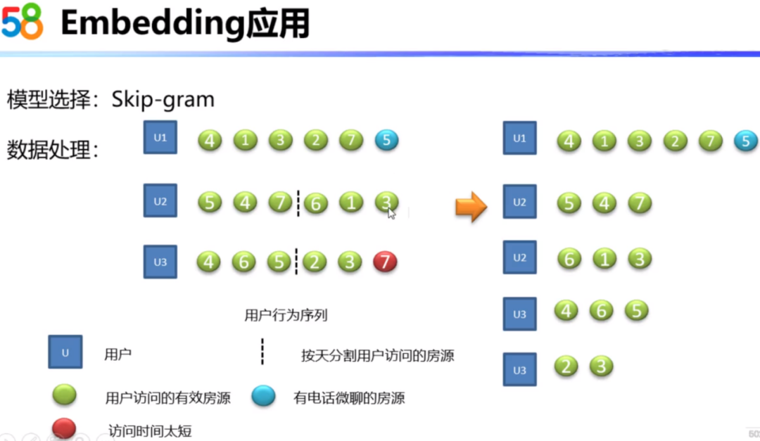 下面就详细介绍Embedding技术在线上的具体应用。首先我们需要对数据进行预处理。这里我们区分了一下房源和用户之间的关系,对于这种只有访问的房源,点击关系是一种弱关系,下图中用绿色表示。电话和微聊是一种强关系,下图用蓝色表示。同时会去掉一些用户停留时间比较短的房源,这些可能是用户的误触。对于一个用户多天的行为序列,会进行按天的分割,因为隔两天的用户浏览房源数据差异就比较大了,会影响模型的计算。经过处理可以得到下图右边的房源序列。
