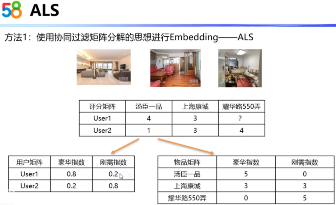 我们可以使用ALS进行Embedding,ALS是通过矩阵分解实现的协同过滤。使用ALS我们需要构建一个评分矩阵,比如下图所示的例子,User1对汤臣一品的打分是4分,对上海康城的打分是3分,未对耀华路550弄打分。User2对汤臣一品的打分是1分,对上海康城的打分是3分,对耀华路550弄打分是4分。这是一个 的评分矩阵,我们通过ALS算法可以把它分解成一个 的矩阵和一个 的矩阵。 的矩阵就是一个用户矩阵, 的矩阵就是一个物品矩阵。