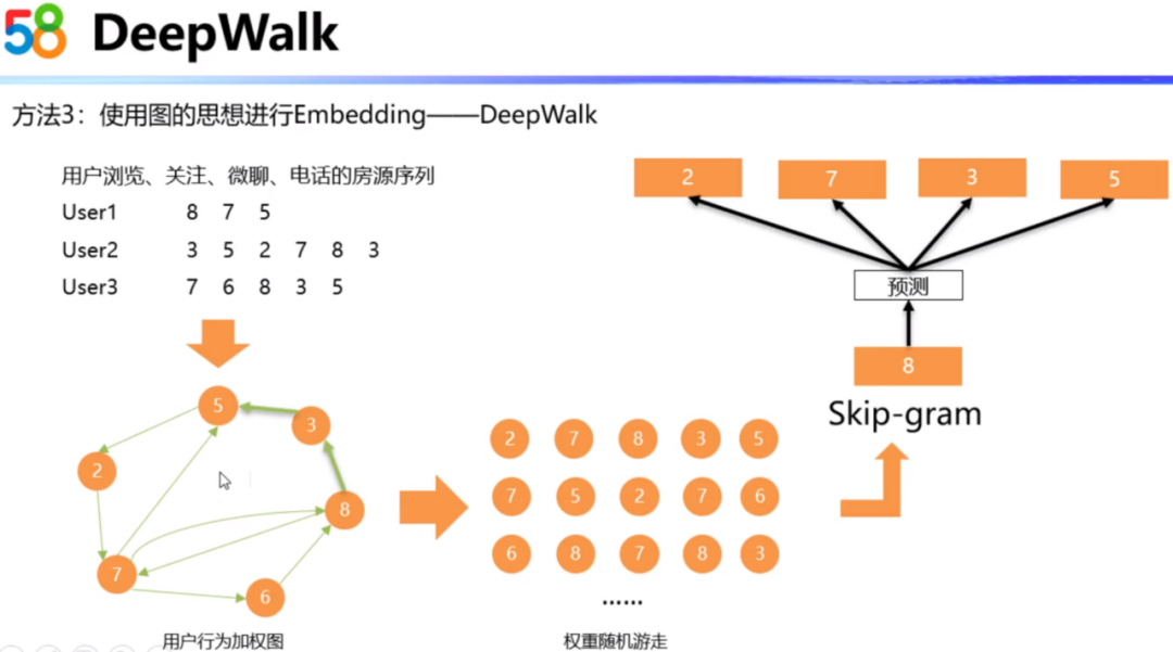 第三种方法是通过使用图的思想进行Embedding。我们针对Skip-gram方法中的用户行为,可以将用户的房源序列抽象为有向带权图,然后轮流以每个结点为出发点,根据权重做随机游走,这样就可以形成新的房源序列,最后对这些不同的房源序列继续使用Skip-gram模型,得到不同的房源的Embedding向量。