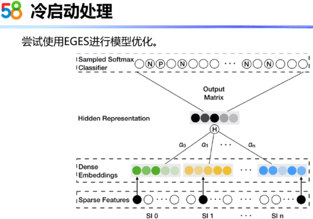 上面提到的在房源序列中引入房源类型的做法,是需要先指定好房源的特征组合,这样会造成可扩展性不强。目前,我们也在尝试使用阿里的EGES进行Embedding。这里的SI0(Side Information 0)代表房源本身的ID,后边的SI1,...,SIn代表不同类型的属性。不同的房源属性都有不同的输入矩阵,便于计算出不同属性的权重进行组合,这样每个属性都有自己的向量,也可以解决新房源冷启动的问题。