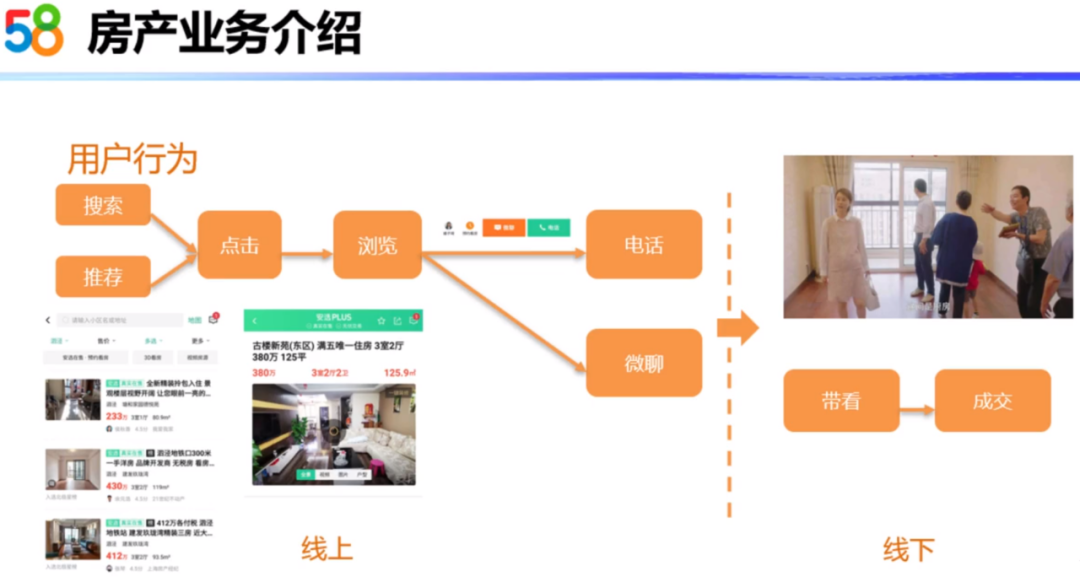 58平台的推荐主要针对的是找房的用户,所以这里重点介绍一下找房用户的行为。当用户有找房需求的时候,可以在房源列表页按照自己的需求进行搜索和筛选房源。同时可以在推荐位浏览到平台推荐的房源,当看到符合自己需求的房源时,可以点击帖子,进入到房源的详情页。如果房源详情页的信息符合自己的找房需求,就可以通过电话或微聊的形式联系发布房源的经纪人。上述的这些行为属于用户的线上行为。当用户和房产经纪人联系后,经纪人可以带着用户看房。如果合适的话,进行最终的成交。这些是属于用户的线下行为。