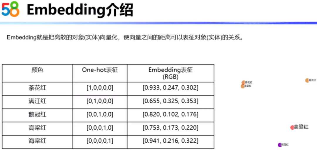 比如下图中的例子,有五种颜色,总体来说的话都是红色,但对于我们大多数人来说对这些红色是没有概念的,也不清楚哪些红色是比较相近。如果我们知道这些颜色的RGB值,就可以轻松的了解这些红色之间的关系。我们通过RGB值知道,茶花红和海棠红这两个颜色是比较相近的。其实颜色的RGB值可以简单的理解为对颜色这种实体的Embedding。