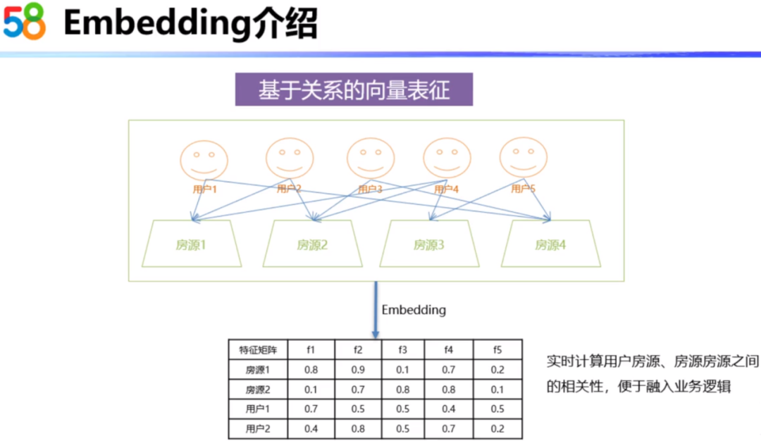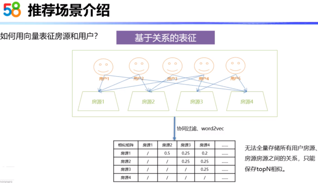 基于关系的表征一般使用的方法是协同过滤、Word2Vec。基于关系的表征一般是使用相似度表进行保存。由于相似度表无法全量保存用户与房源、房源与房源之间的关系,只能保存TopN的相似度。这种存储实际上会存在一些问题,比如在零少结果的场景,根据用户的搜索标签是可以召回一批房源的,但是这个召回房源可能与用户TopN的相似房源交集比较小,所以在召回的大部分房源中很难引入关系特征。因此就需要引入Embedding的思想,来对关系进行量化。