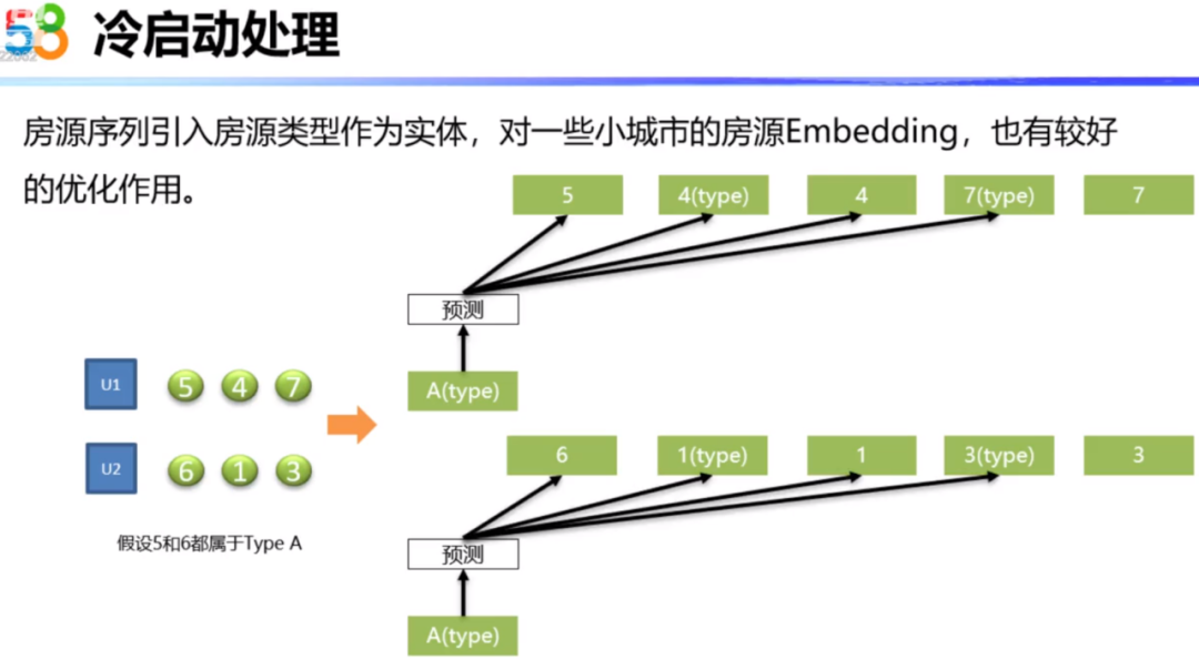 同时引入房源类型作为实体之后,对于一些用户比较少、房源序列比较少的小城市的房源Embedding有比较好的优化作用。比如,下图中用户U1看了5、4、7,用户2看了6、1、3,如果在其它的房源序列中没有出现5和6共现的情况,这个时候Embedding就无法学到房源5和房源6之间的关系,但是我们引入了房源Type类型,通过引入5和6的Type类型都是A,这样可以有效的知道房源5和房源6是有一定相似性的。