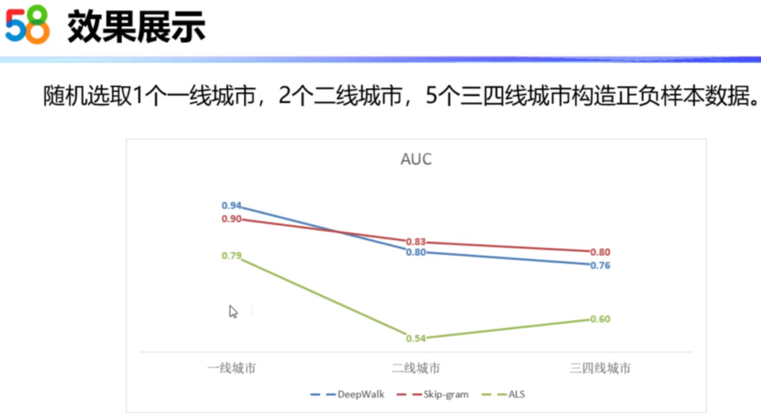 上图不太能直观的展示出哪种Embedding效果好,这里我们构造出了一批正负样本,通过样本数据的AUC值,来评测样本Embedding的效果。这里的正样本取的是共现次数比较多的房源对,取了没有共现的高频房源作为负样本。从下图结果可知,DeepWalk在一线城市效果还是比较好的,可能因为这一块用户量比较大,对于DeepWalk模型可以得到充分的训练,可以随机游走出一些比较好的房源序列。在二线城市和三、四线城市的话,Skip-gram算法要优于DeepWalk算法,可能是因为小城市数据量比较少,所以DeepWalk差一些。对于ALS,它在一线城市的效果还不错,但是到了二线城市和三、四线城市降低了很多,应该还是由于打分矩阵过于稀疏,无法做一个很好的训练。