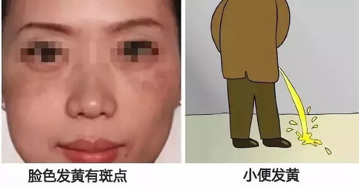 肝功能水平低,身体毒素堆积,2个地方发黄,一是脸色发黄有色斑,二是小便是暗黄色。