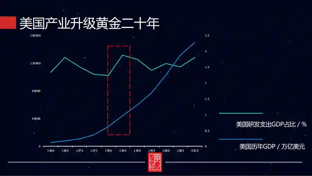 从上图绿色的曲线中可以看到,当年美国研发支出的 GDP 占比达到了 3%。通过在信息技术方面以及对产业升级的大力投入,美国迎来了从 1982 年到 1999 年近 20 年的迅猛增长。美国的零售服务业、生产性服务业、电子信息制造业,甚至包括第一产业的农业和养殖业,20 年间在技术和资本市场的驱动下实现从小散到规模化集约,诞生了一大批世界级的优秀企业,引领产业发展。我们研究后称之为,美国产业升级的黄金 20 年。