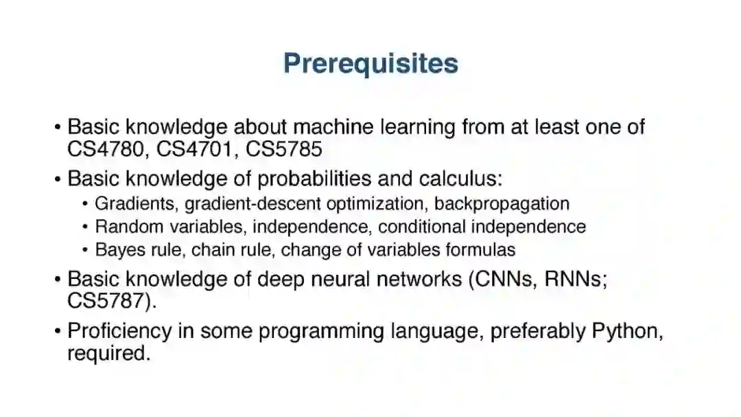 生成模型是一类机器学习算法,它定义了图像、序列和图等复杂高维物体的概率分布。深度神经网络和优化算法的最新进展显著地增强了这些模型的能力,并重新激发了对它们的研究兴趣。本课程探讨深度生成模型的基本概率原理、它们的学习算法和流行的模型族,包括变分自编码器、生成对抗网络、自回归模型和规范化流。本课程还涵盖了计算机视觉、自然语言处理和生物医学等领域的应用,并将其与强化学习领域联系起来。