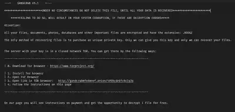 病毒名叫 GANDCRAB,2018年年初出现的,老爸中招的是 V5.1 版变种,更新于2018年12月份。该病毒在每一个被感染的目录中都留了一个 RODGZ-DECRYPT.txt 文件。