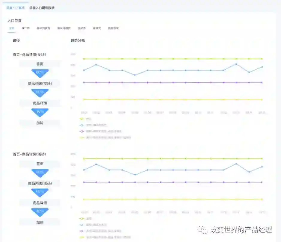 问题二:因为问题一只能解决总体转化率,要想定位到底是那里的转化率低导致整体转化率低的原因,还得看用户每个入口路径各环节的转化率。