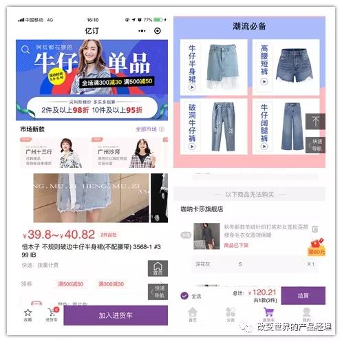 图片 来源:亿订电商, 从左到右以此为:首页、商品列表、商品详情、加购、结算页
