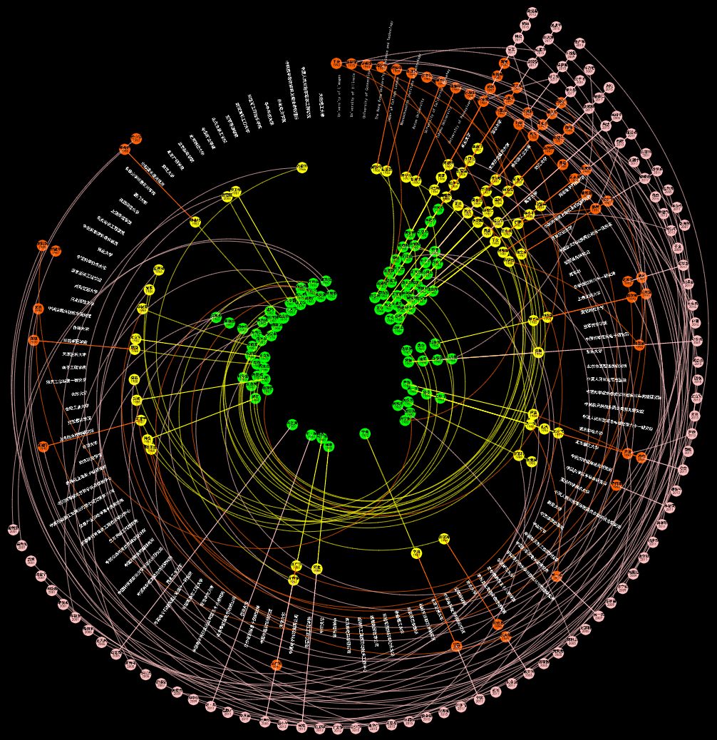 此外,通过对于处内关键词的词频的分析,我们也可以看到一些现象,例如图中左下角的绿色的四处部分,其早年间的关键词通常都是包括光学等基础理论,而近年来,则更加偏向于诸如量子等更加趋向于应用和前沿的词语,这也说明了这一学科理论的逐渐完善,和新领域的不断开拓。而类似的现象也发生在了一处的关键词之上,诸如微波、电磁场等关键词,其与外围年份对应的连边中,粉色系边的数量明显要多于青色系的数量,也即也体现出了明显的偏向于早年的特点。