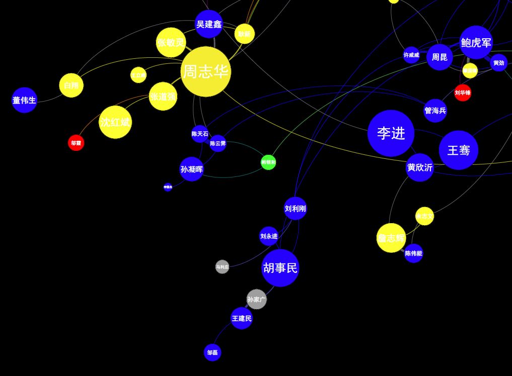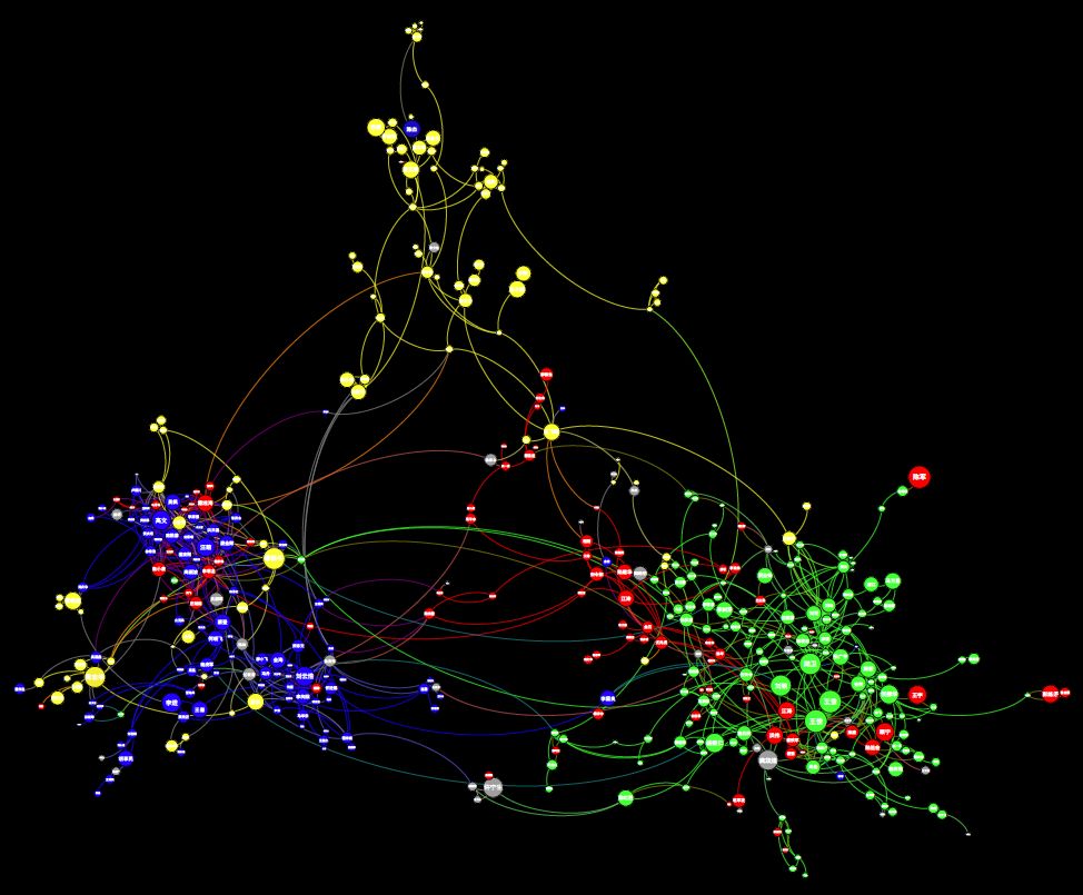 图1中的节点代表获评人才项目的学者,不同颜色代表获评时所在的信息科学部下属部门,红色代表一处(电子学与信息系统学科),蓝色代表二处(计算机科学学科),黄色代表三处(自动化学科),绿色代表四处(半导体、光学与光电子学科)。节点之间的连边代表合作关系,边越宽意味着合作次数越多,节点距离越近,意味着相似度更高、合作更紧密。依据合作关系可以明显将学者分为三个星系团(社区):三处中涉及控制理论和系统科学的学者位于图中上方,人数较少,与其他两个星团距离较远;从图中可以观察到有部分黄色和红色节点与蓝色节点合作紧密,和二处计算机方向学者共同位于图中左下角;一处和三处涉及电子、通信和半导体等研究,研究方向相近,彼此合作非常紧密,呈“你中有我,我中有你”模态,位于图中右下角。