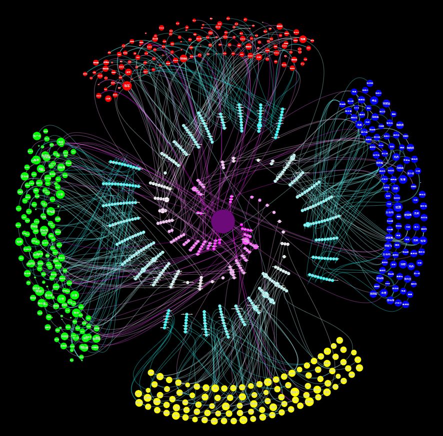 而与之对应的,我们又同时绘制了如图8所示的关键词-年份-申请人对照图。图中呈螺旋放射状的节点是代表关键词的节点。类似的,节点由内向外依次由粉色逐渐过渡为青色,分别代表了1997-2018年这21年间的关键词变化。特别的,如果一个关键词在某年的某个处出现不止一次的话,我们则会将该年该词对应的节点放大。同样的,我们把当选的杰青,按照其当选时的处信息,按照红色、蓝色、黄色、绿色与一处至四处一一对应,放在了图的外围。而代表人和代表关键词的连线,则说明该人在该年当选杰青时,其项目信息涉及了这个关键词。其中,代表一处的红色点的杰青人数为135,代表二处的蓝色点的杰青人数为107,代表三处的黄色点的杰青人数为106,代表四处的绿色点的杰青人数为167。