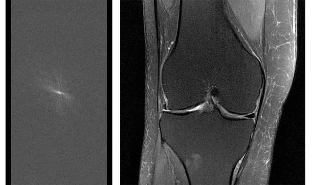 左图:转换成图像之前的原始 MRI 数据。为了获取诊断研究所需的全部原始数据,MRI 扫描会非常耗时。右图:从充分采样的原始数据中获得的膝关节重建 MRI 影像图。
