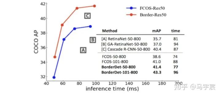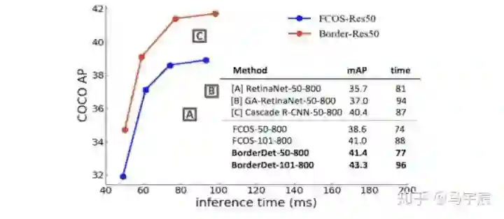 我们提出了一种非常简单、高效的操作来提取物体边界极限点的特征,叫做“BorderAlign”。模型只增加很少的时间开销,可以在经典模型上FCOS(38.6 v.s. 41.4). FPN(37.1 v.s. 40.7)。下面是我们的方法和这些经典模型的对比。