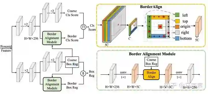 对于来自于FPN的特征,borderAlign需要5xC的border-sensitive的特征图,所以需要将通道先升维,提取完后再降维。为了“最干净”的验证Border feature的有效性,BAM中使用1x1conv来做升降维,几乎不增加模型的计算量。最后还原到256通道,来做最终的边界的分类和回归。
