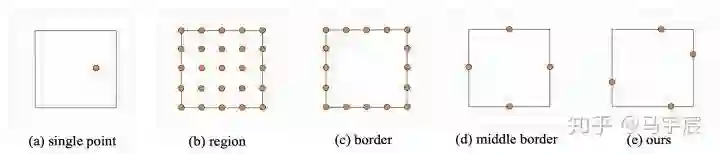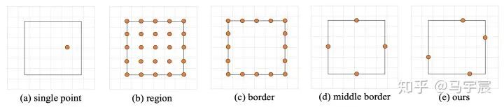 基于上述两条“痛点”,我们觉得提取物体的边界极限点的特征是不是能对物体精准定位有一些帮助?于是乎我们做了最基础的一些实验,我们基于FCOS的检测器,增加一些enhancement的特征来加强单点特征。主要有4组实验,分别来验证上面提到的两条问题。(1) single point: 单点特征做增强;(2) region: 用ROIAlign提取框内所有特征来增强;(3)border使用边界上所有点的特征来增强 (4)只用边界中心点来增强。这四个实验的特征采样位置如下图,分别对应不同的采样点个数。