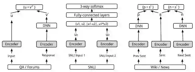 在 Universal Sentence Encoder (https://arxiv.org/abs/1803.11175)这篇论文中,我们提出了一个模型,这个模型通过添加更多的任务来扩展上述的多任务训练,采用类似于 skip 思想的预测给定的文本选项周围的句子的模型共同训练这些任务。然而,我们采用了一个只有编码器的结构来代替原来的 skip 思想中编码器-解码器的结构,我们的结构通过一个共享的编码器来驱动预测任务。采用这种方法,训练时间显著减少的同时仍保留了在各种迁移任务上的表现,包括情感与语义相似度分类。模型的目标是提供一个单独的编码器,它可以尽可能广泛地支持各种应用,包括改写检测、关联性、聚类以及自定义文本分类。