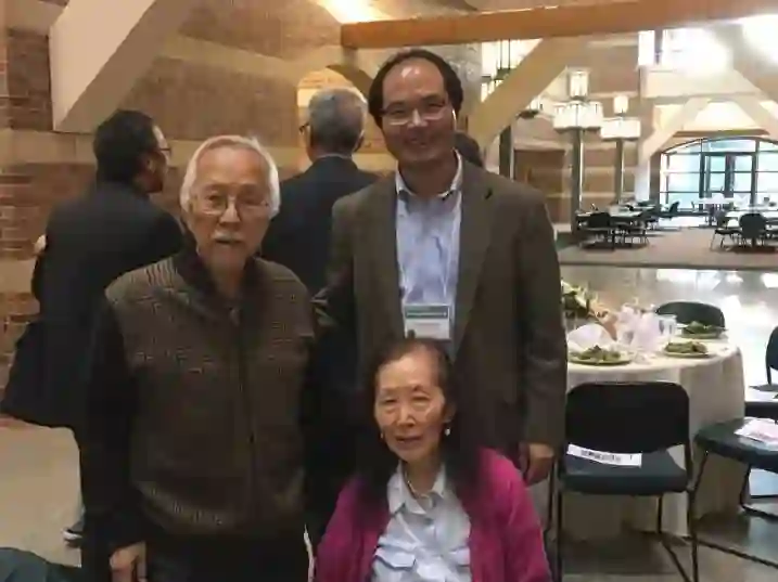 黄老先生一直关心计算机视觉在国内的发展。应该说是为中国培养了第一批计算机视觉领域的领军人才。因为他对中国科研的突出贡献,被授予科学院和工程院的外籍院士。他尤其支持北京微软亚洲研究院的发展。与他共事的十年中,几乎每个暑假都会与他在北京微软研究院共度几周。我2004年暑假回北京结婚时,他和夫人以及微软研究院沈向洋院长作为我男方嘉宾和证人出席。他在我婚礼上的谈笑风生,仿佛就在昨日。我夫人得知先生过世的噩耗,专门找出当时的照片集,其中这一张有Tom与夫人还有我的父亲。可惜照片中的三人如今都不在了:父亲两年前因肺炎过世,而Tom和夫人也在今年先后离开了我们。睹物思人,更加悲从中来。