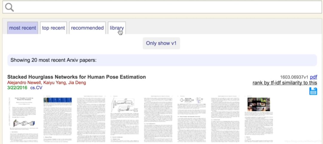 如果你是注册用户,在登录账户之后,还可以把自己感兴趣的文献收藏到你的个人图书馆。比如,我喜欢上图的这篇人体姿态估计的文献,点击右上角存盘图标,(看到了吗?就在' rank by tf-idf similarity to this'下面),点击之后就把这篇文献存在我自己的library里面了。