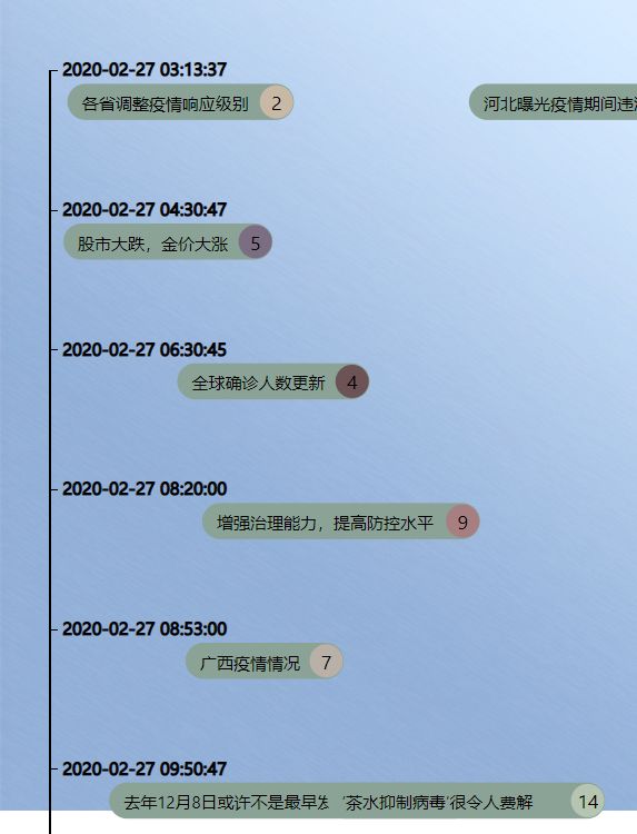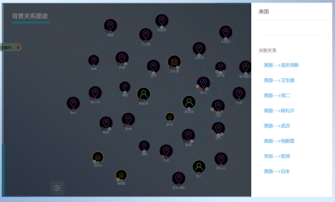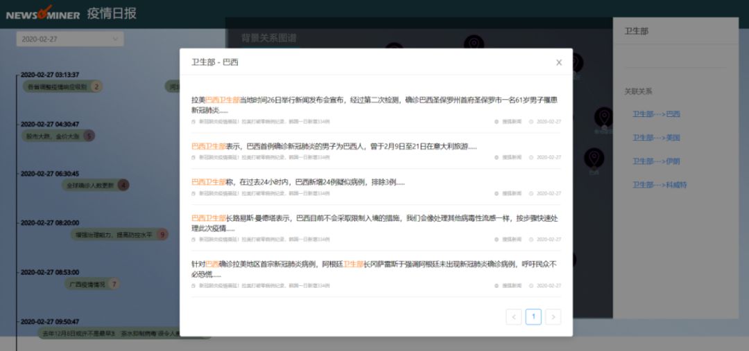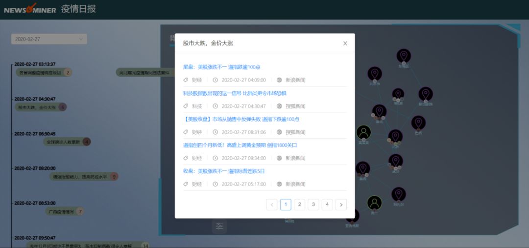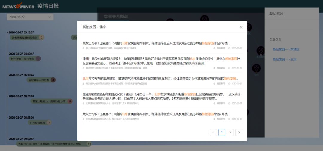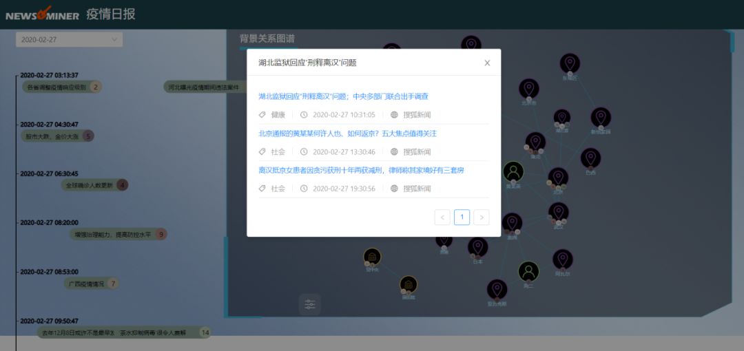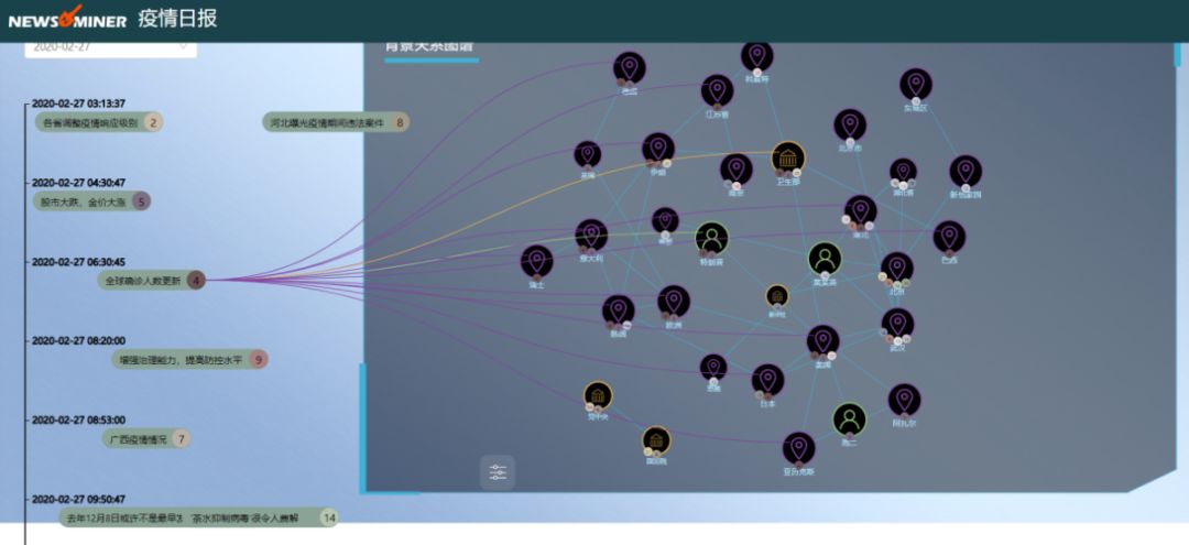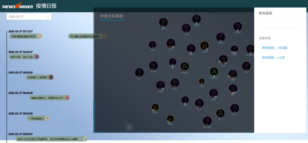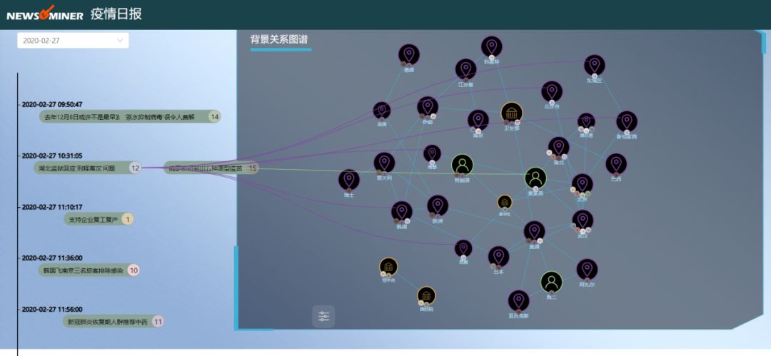 综合了环球网、人民网、网易健康、财新网肺炎疫情、医脉通、人民网疫情专栏、人民网特别关注、华商头条、正保医学教育网、新华健康、主要城市卫健委和疾控中心网站等主流媒体和网站的新冠疫情中文新闻报道,我们随机抽取3篇新闻分别从新冠疫情新闻事件流、热门人物、地区和组织机构关系、背景关系图谱几个方面分析其中的人物和新闻之间的关系。
