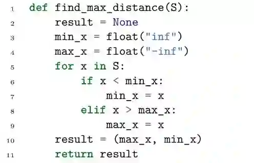 例如,假设我们要在大小为 N 的一组示例 S 中寻找两个最遥远的一维示例。我们可以用 Python 写出如下所示的算法来解决这个问题: