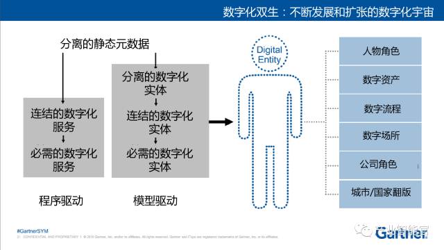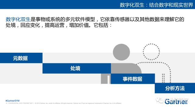 在三到五年内,数以亿计的物件将由数字化双生的形式呈现。组织将使用数字化双生主动修复和规划设备服务、规划制造流程、操作工厂、预测设备故障或提高运营效率,以及执行增强的产品开发。因此,数字化双生最终将成为技术人员和传统监测设备和控制(例如,压力计,压力阀)的组合的代理。