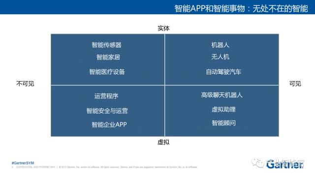 “应用人工智能和高级机器学习带来了一系列智能实现,包括物理设备(机器人,自动车辆,消费电子)以及应用和服务(虚拟个人助理(VPA),智能顾问)”。这些实现将表现为新一类的智能应用和物件,以及为广泛的网格设备和现有的软件和服务解决方案提供嵌入式智能。