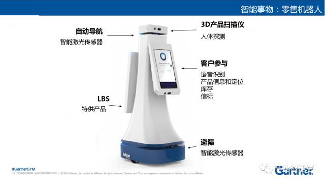 智能事物的预测,就是认为在可以预期的未来,任何事物都可以智能化,比如消费者产品、医疗产品、嵌入式产品等等。但这个预测已经滞后了,现在已经有这方面的产品,甚至都具备了可用性。比如Google、Uber研发的应用在通用道路的自动车辆;运用在特定环境的自动驾驶汽车:如无人收割机等;以及各种各样的机器人,比如零售机器人、迎宾机器人等等。