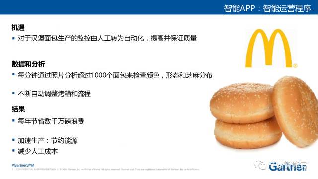 麦当劳生产汉堡包运用了智能App,对汉堡包面包生产的监控由人工专为自动化,能够提高并保证质量。智能应用还拥有数据和分析的优势,如,每分钟通过照片分析超过1000个面包来检查颜色、形态和芝麻分布,并根据分析结果不断自动调整烤箱和流程,以保证生产最好的汉堡包面包。其带来的结果显而易见:避免了浪费,每年节省数千万元;加速生产并节约能源;减少人工成本。