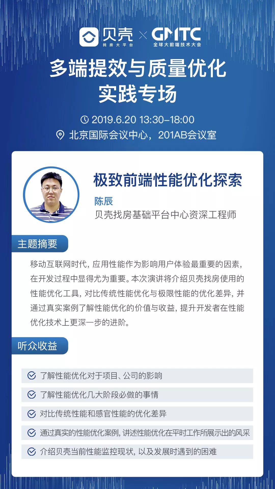 6 月 20 日,2019 GMTC 全球大前端技术大会 《多端提效与质量优化》技术专场,我们邀请了贝壳找房前端架构负责人、慕课网认证前端性能讲师陈辰(cc),为大家解读《极致前端性能优化》,介绍贝壳找房使用的性能优化工具,对比传统性能优化与极限性能的优化差异,并通过真实案例了解性能优化的价值与收益,提升开发者在性能优化技术上更深一步的进阶。